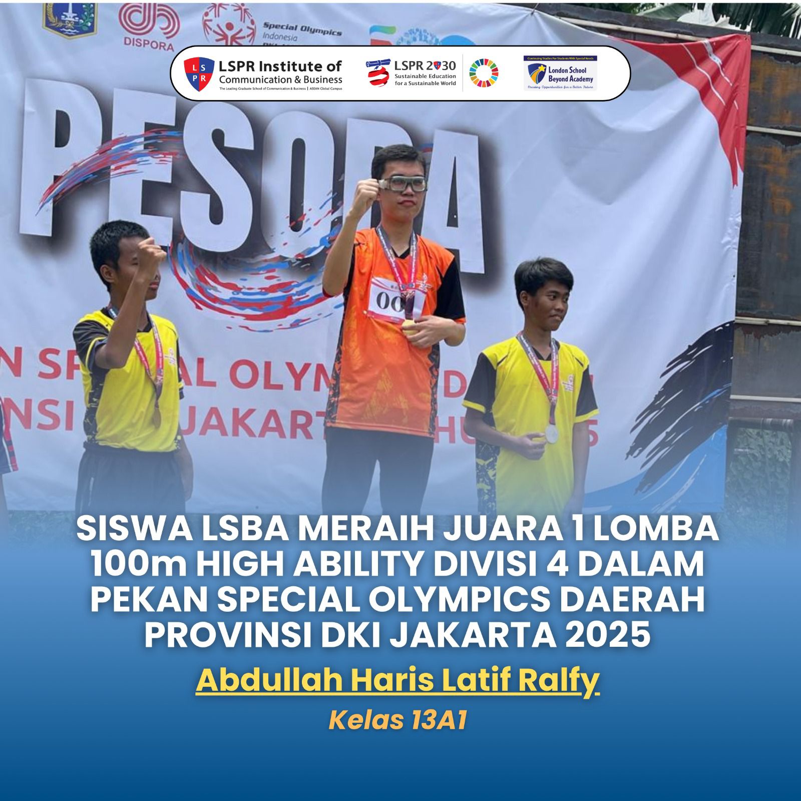 SBA Bangga! Abdullah Haris Latif Ralfy meraih Juara 1 Lomba 100m High Ability Divisi 4 di Pekan Special Olympics Daerah Provinsi DKI Jakarta 2025.