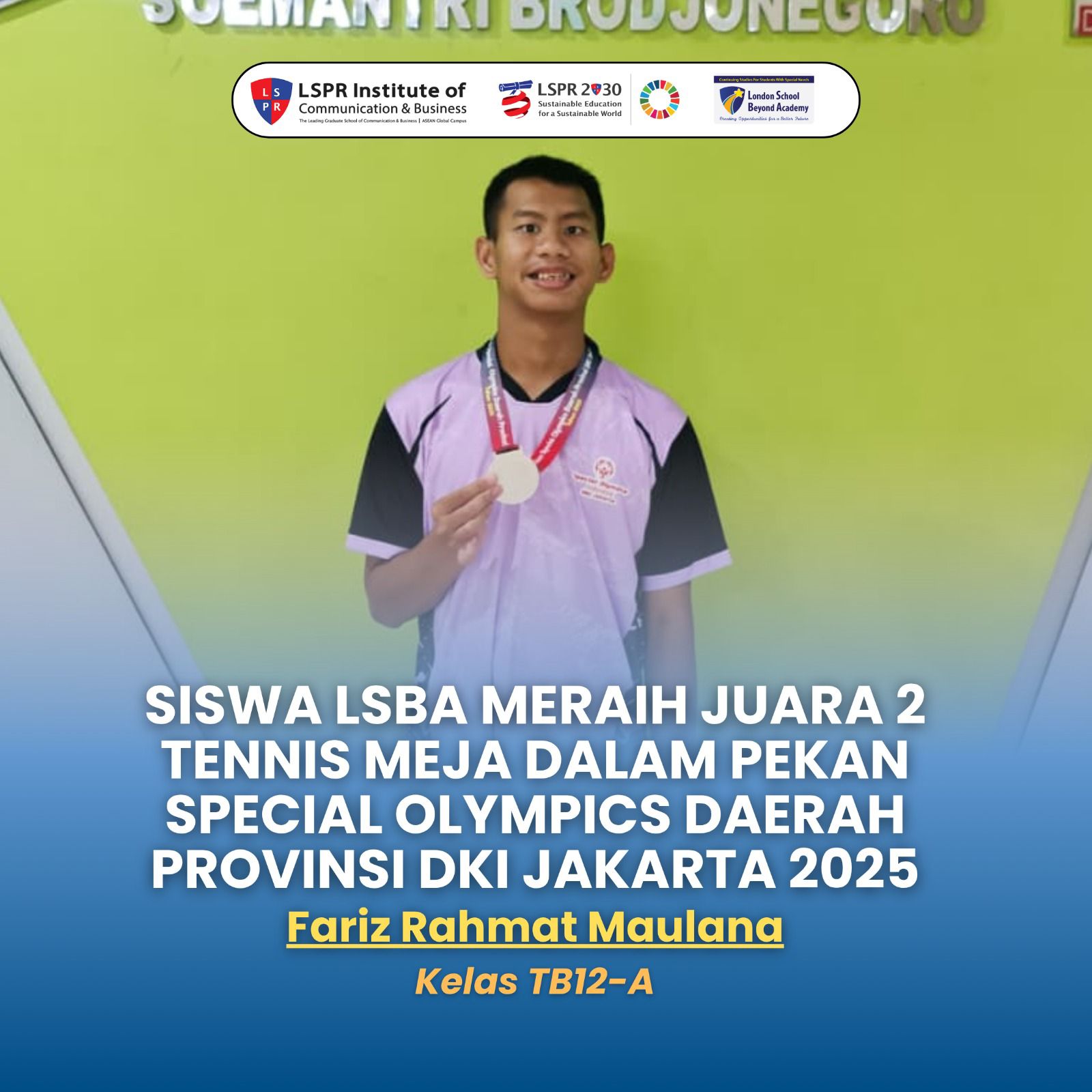 LSBA Bangga! Fariz Rahmat Maulana meraih Juara 2 Lomba Tenis Meja di Pekan Special Olympics Daerah Provinsi DKI Jakarta 2025.