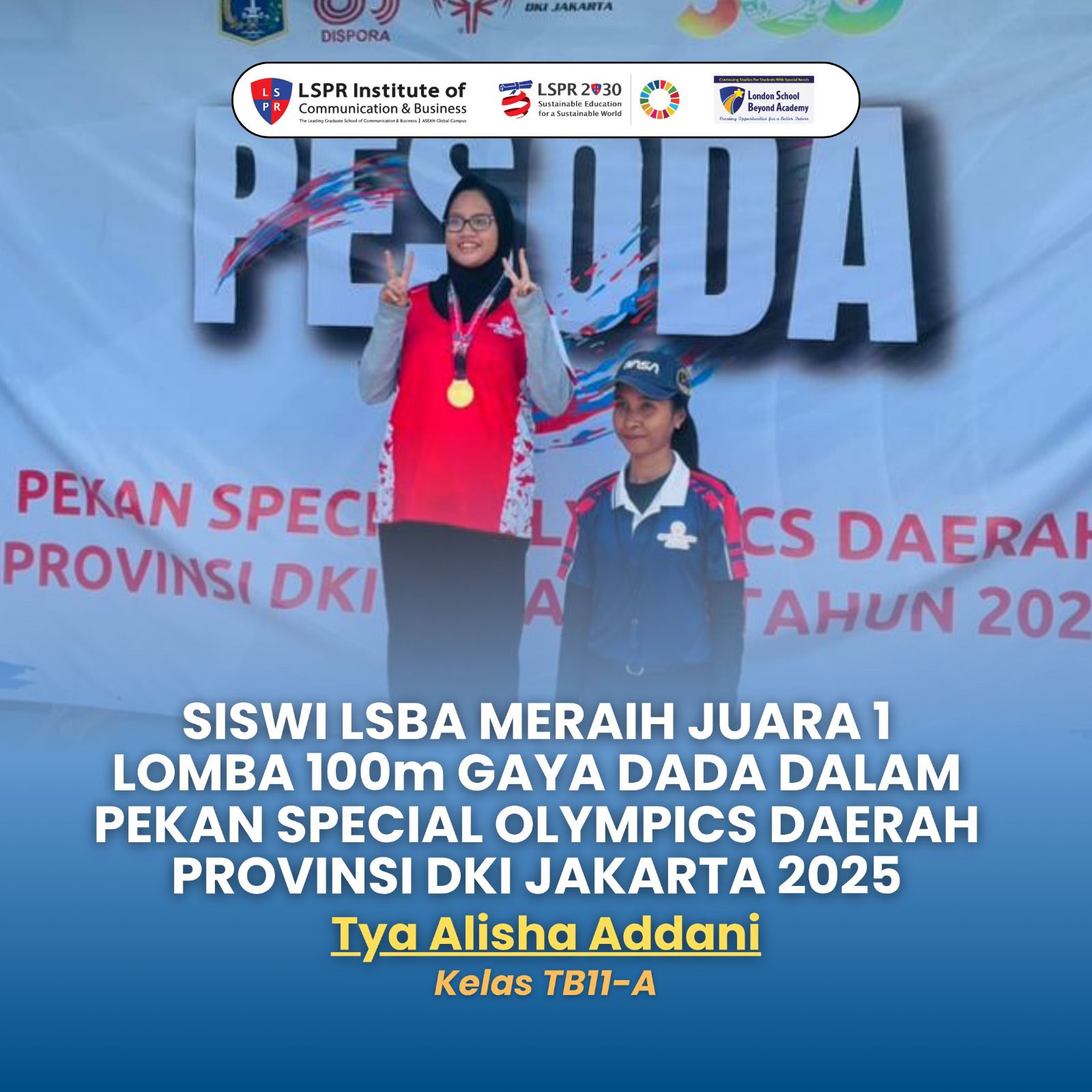 LSBA Bangga! Tya ALisha Adani meraih Juara 1 Lomba 100m Gaya Dada di Pekan Special Olympics Daerah Provinsi DKI Jakarta 2025.